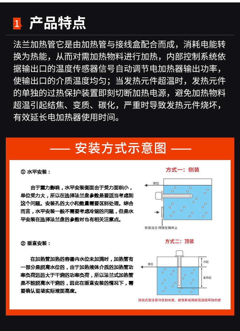 垂直安装的时候,在加热管加热的容器内水位未加满时,加热管有一部分是脱离水位的,由于加热液体介质的加热管功率负荷远远大于干烧的功率负荷,所以法兰加热管是不能脱离水干烧的,因此在垂直安装的情况下,如果不能保持加热管全部浸入水中加热,那么建议用户留有一部分冷端(冷端大小的选择按最低水位为准),做好液位控制器。